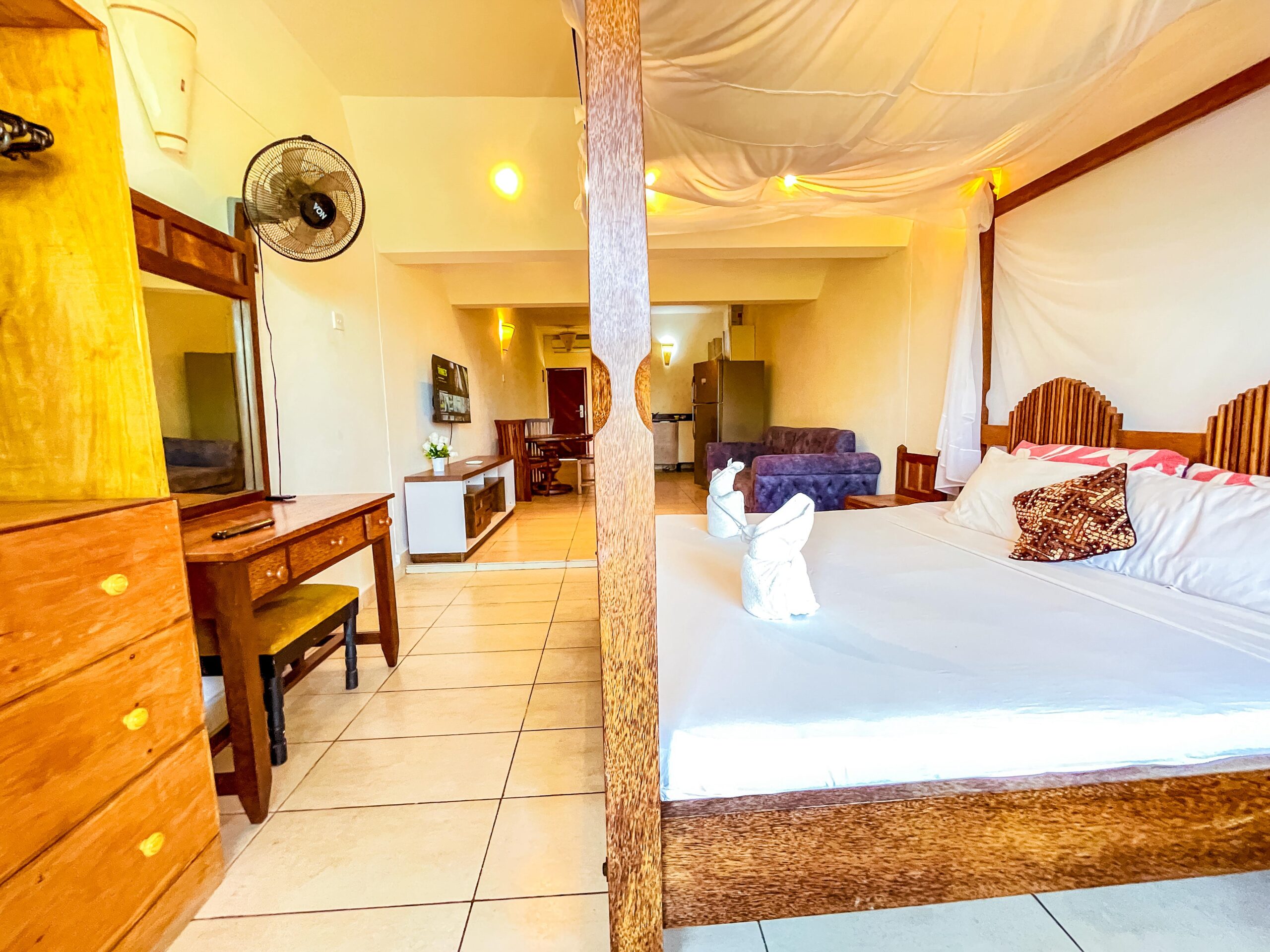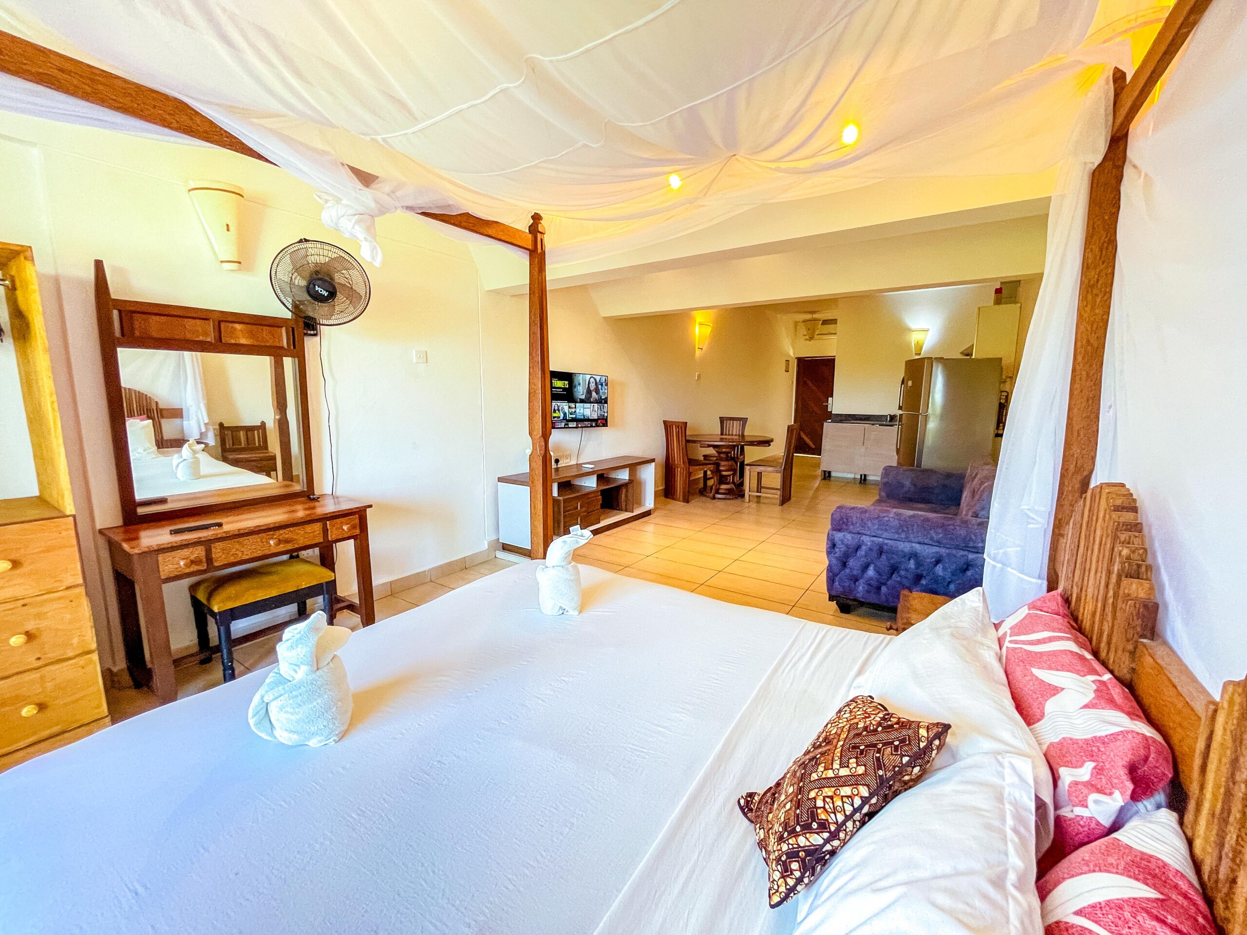 Welcome to Studio Apartment A104, a modern coastal retreat nestled within the beautiful Golden Sun Resort in Diani. Designed for relaxation and comfort, this charming studio apartment is ideal for couples or solo travelers looking to unwind by the ocean.